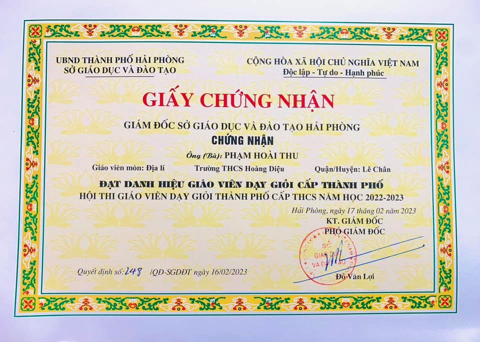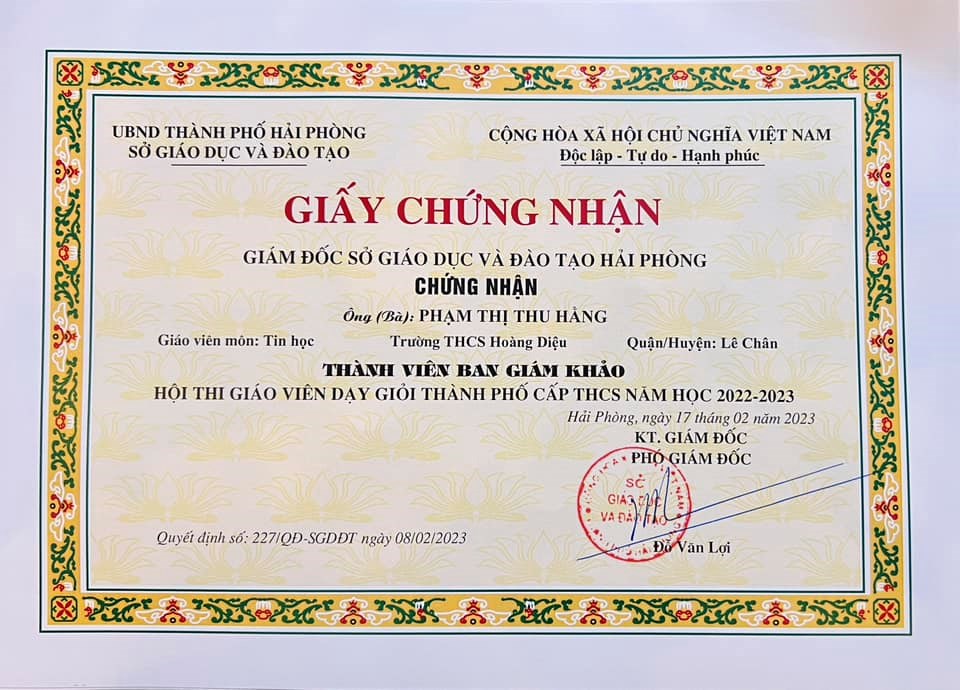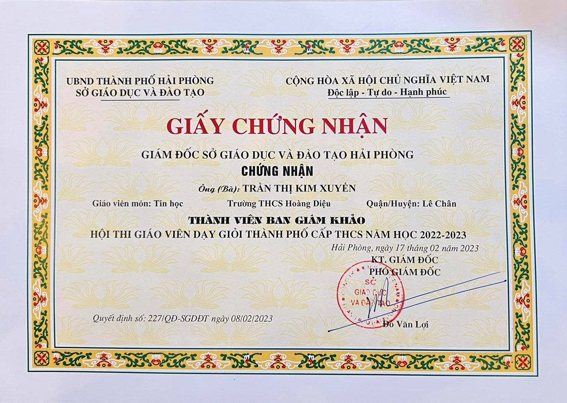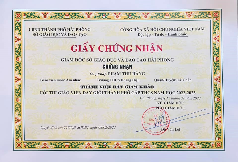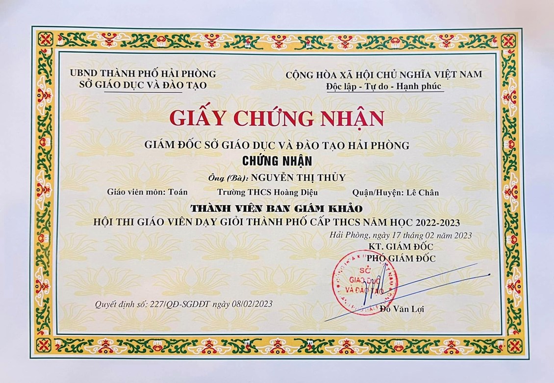 Năm học này, trường THCS Hoàng Diệu tiếp tục đón nhận tin vui khi có 6 đồng chí giáo viên vinh dự tham gia thi và chấm thi tại Hội thi Giáo viên dạy giỏi cấp Thành phố. Trong đó có: