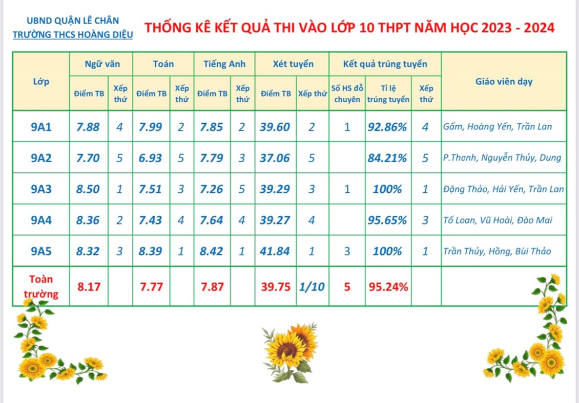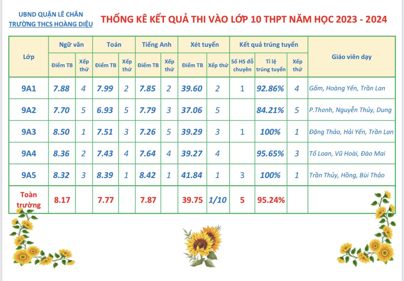 "Vất vả trồng cây, có ngày hái quả". Tiếp nối truyền thống tự hào, thầy và trò Trường THCS Hoàng Diệu lại điểm tô thêm bao bông hoa rực rỡ vào vườn hoa thành tích của nhà trường. Được sự quan tâm chỉ đạo của các ban ngành, đoàn thể; sự chỉ đạo sát sao của Ban giám hiệu; tấm lòng tâm huyết, yêu nghề của các thầy cô giáo; sự phối hợp, đồng hành của các bậc phụ huynh và ý chí nỗ lực, cố gắng của các em học sinh, nhà trường đã hoàn thành xuất sắc nhiệm vụ năm học, đặc biệt đã đạt được những thành tích cao trong kì thi vào lớp 10 THPT năm học 2023 – 2024, đưa trường THCS Hoàng Diệu lên vị trí đầu tiên của Quận Lê Chân và thứ 5 toàn thành phố, trong năm học này, cụ thể như sau: