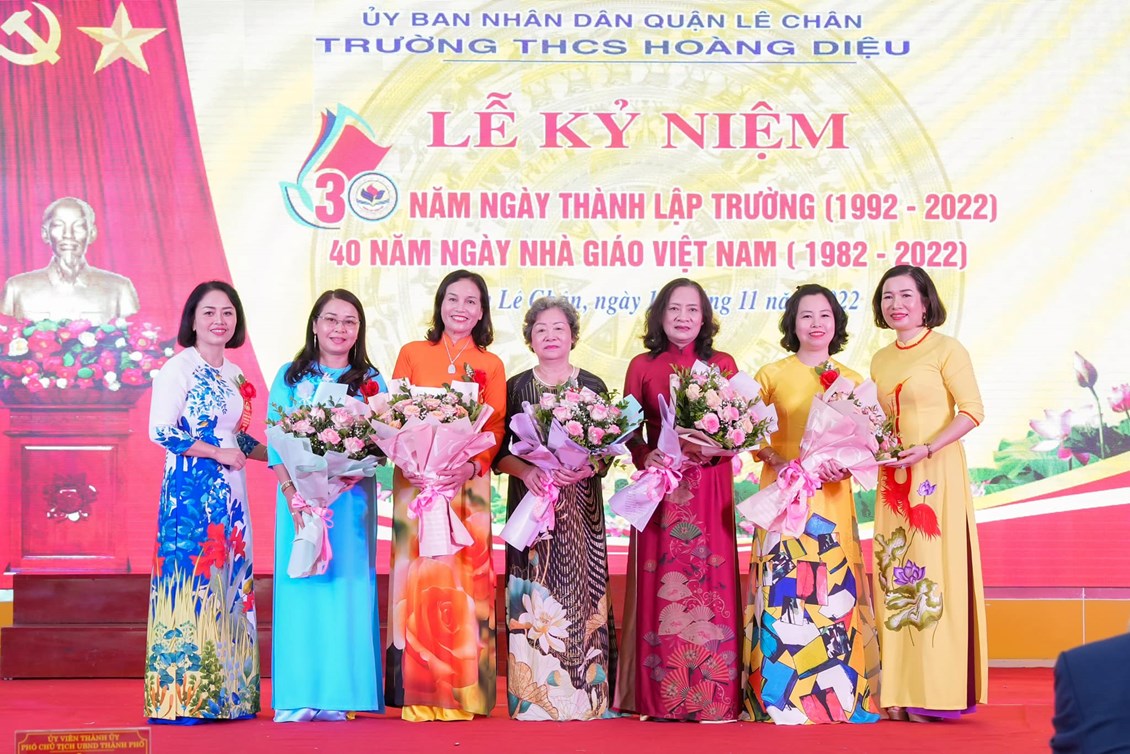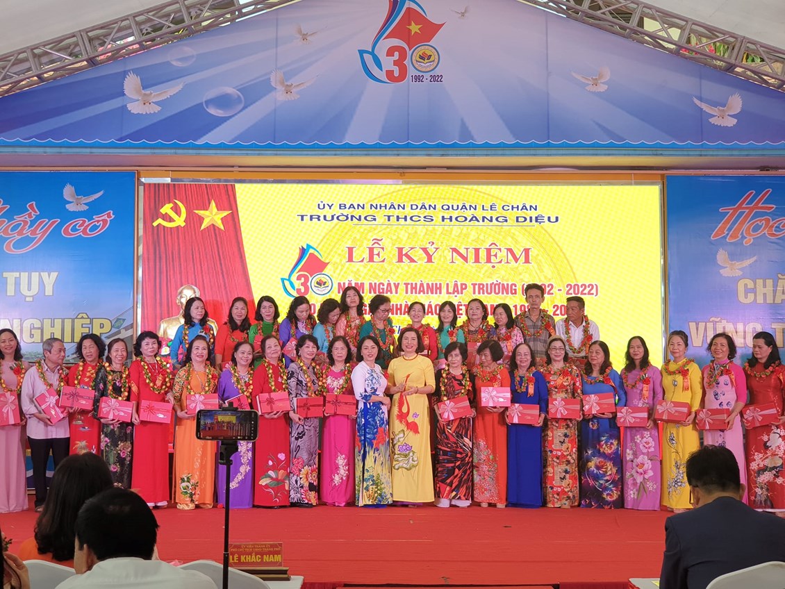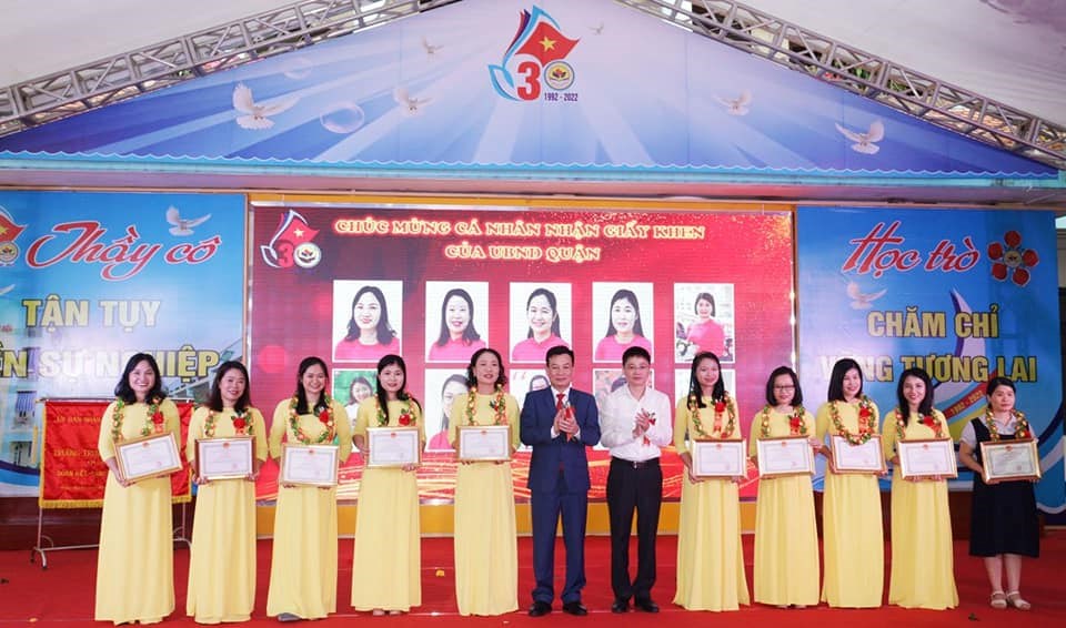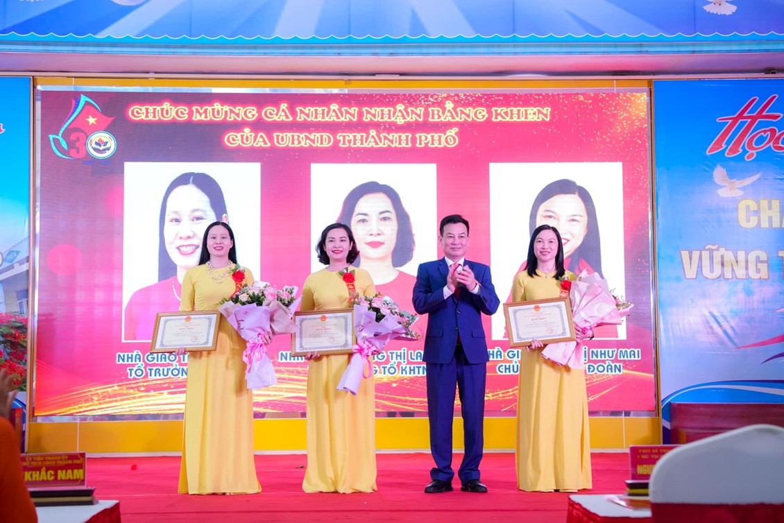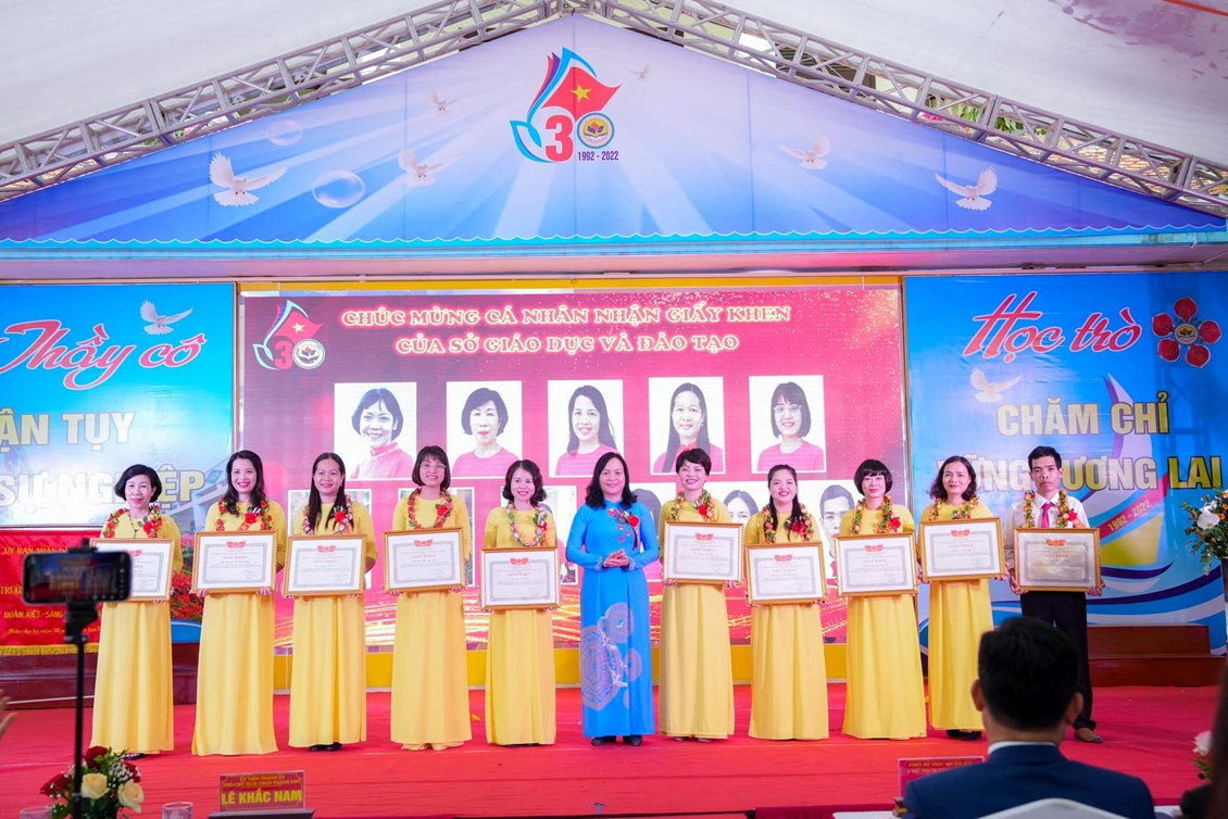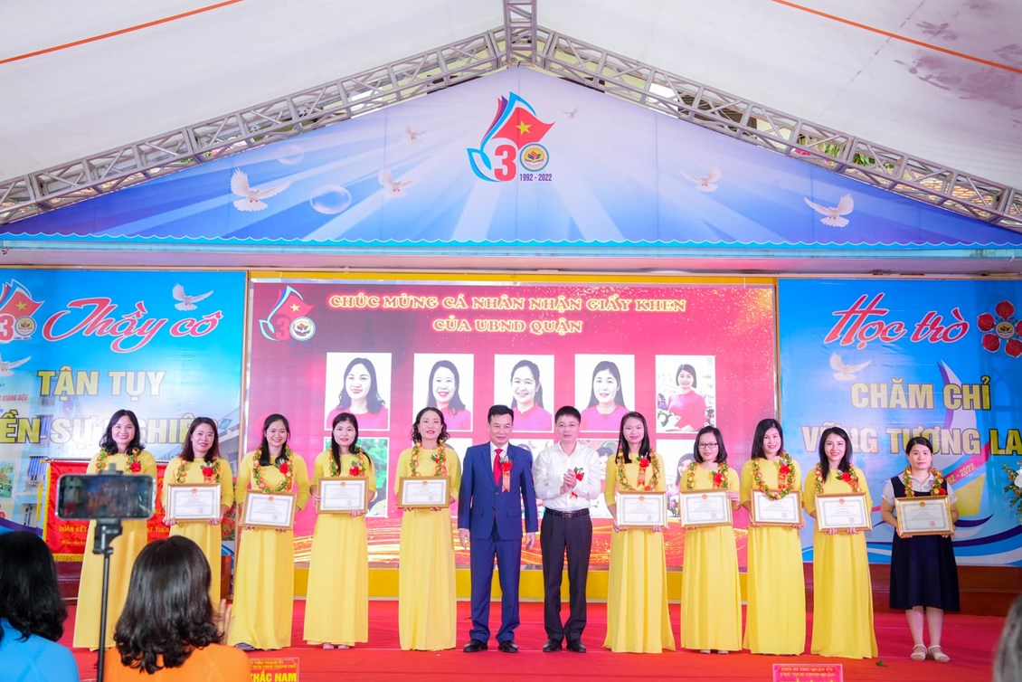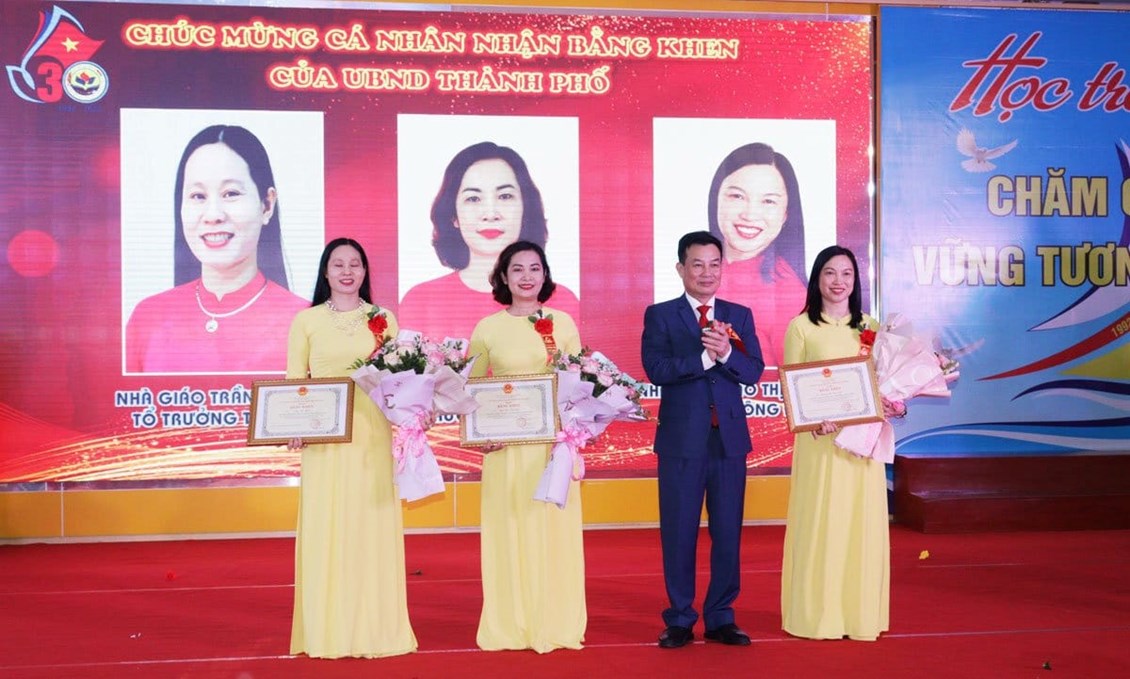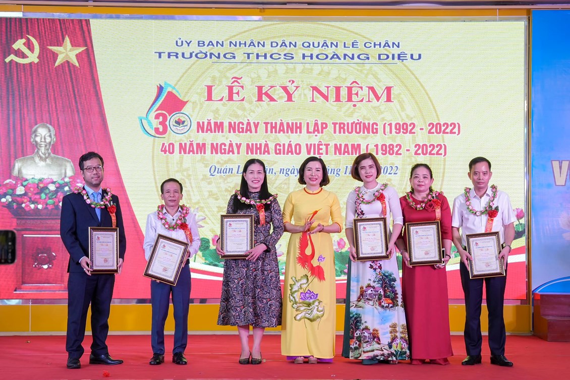 Để có được hành trình 1/3 thế kỉ đó, không thể không kể đến công sức và tâm huyết của bao thế hệ cán bộ, giáo viên, nhân viên Nhà trường. Bà Trương Thúy Hà - Phó Trưởng phòng Nội vụ quận Lê Chân đã lên công bố các quyết định và điều hành nghi lễ khen thưởng, ghi nhận những cống hiến và động viên các thầy cô giáo với: Tập thể Nhà trường và 2 đồng chí lãnh đạo nhận Bằng khen của Bộ GD&ĐT; 3 nhà giáo nhận Bằng khen của UBND Thành phố; 11 Nhà giáo nhận Giấy khen của Sở GD & ĐT; 10 Nhà giáo nhận Giấy khen của UBND quận Lê Chân.