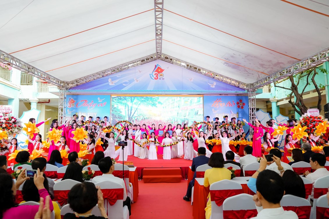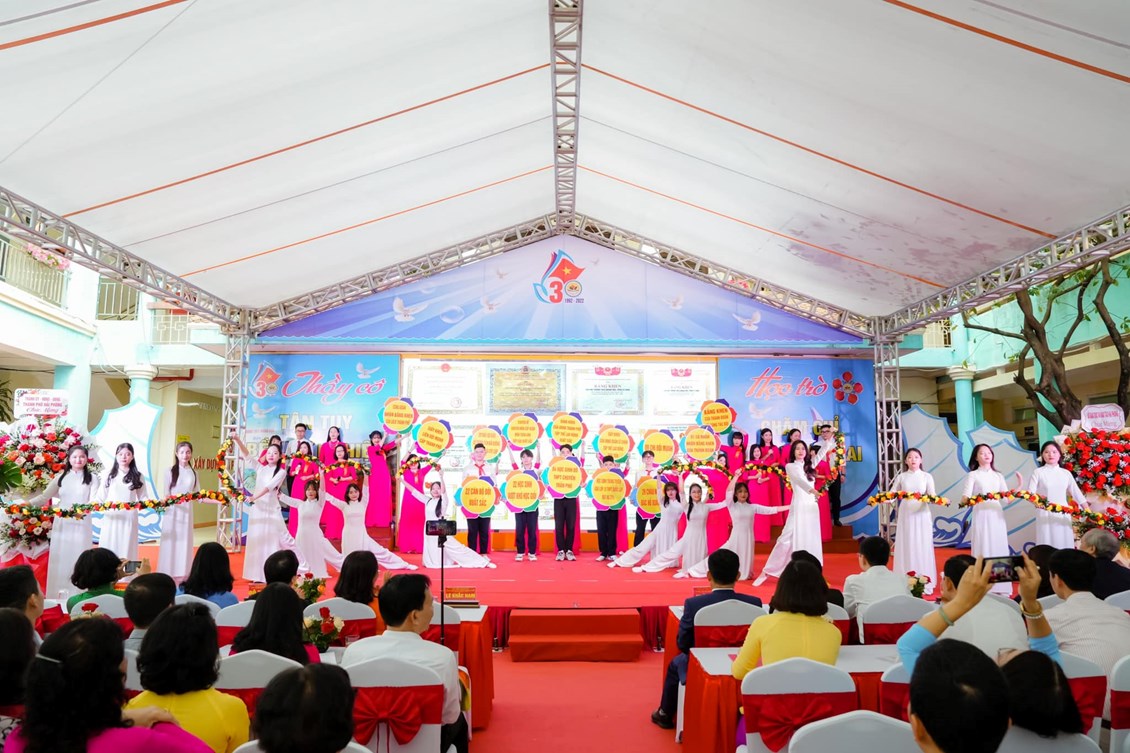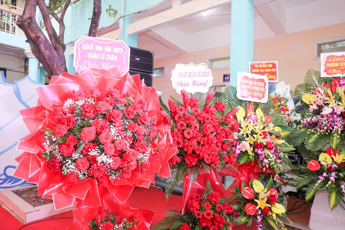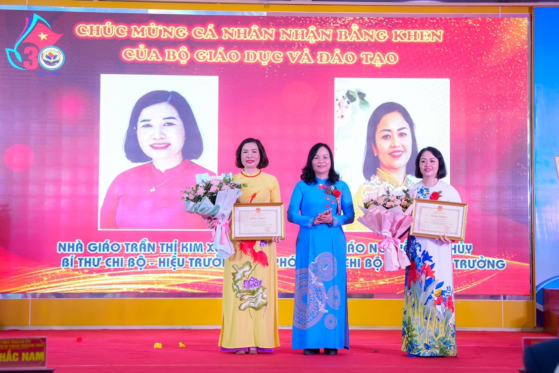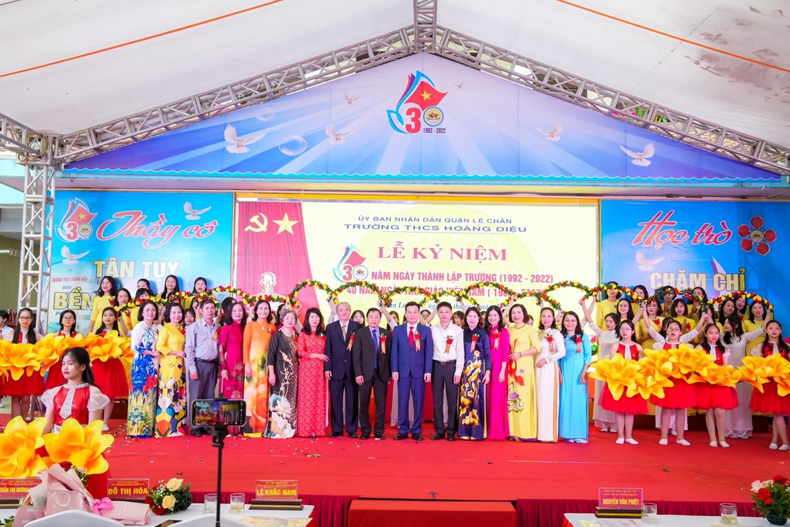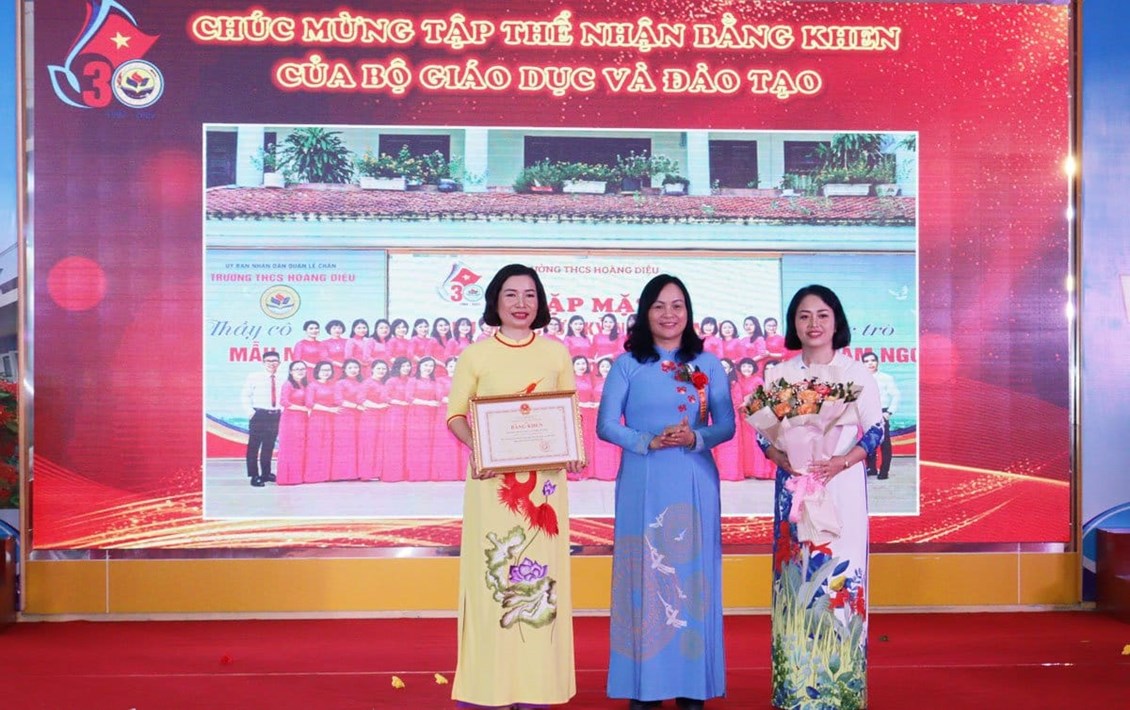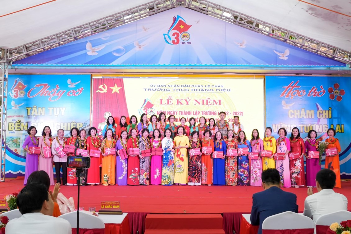 Để có được hành trình 1/3 thế kỉ đó, không thể không kể đến công sức và tâm huyết của bao thế hệ cán bộ, giáo viên, nhân viên Nhà trường. Bà Trương Thúy Hà - Phó Trưởng phòng Nội vụ quận Lê Chân đã lên công bố các quyết định và điều hành nghi lễ khen thưởng, ghi nhận những cống hiến và động viên các thầy cô giáo với: Tập thể Nhà trường và 2 đồng chí lãnh đạo nhận Bằng khen của Bộ GD&ĐT; 3 nhà giáo nhận Bằng khen của UBND Thành phố; 11 Nhà giáo nhận Giấy khen của Sở GD & ĐT; 10 Nhà giáo nhận Giấy khen của UBND quận Lê Chân.