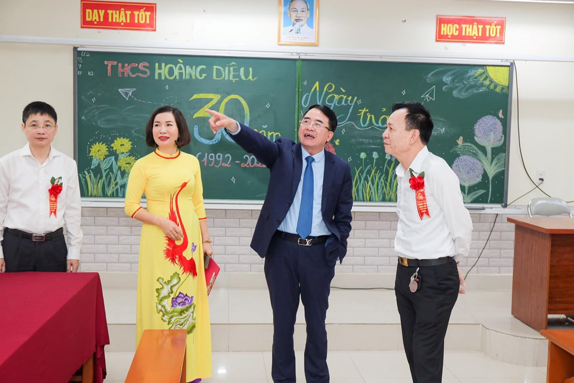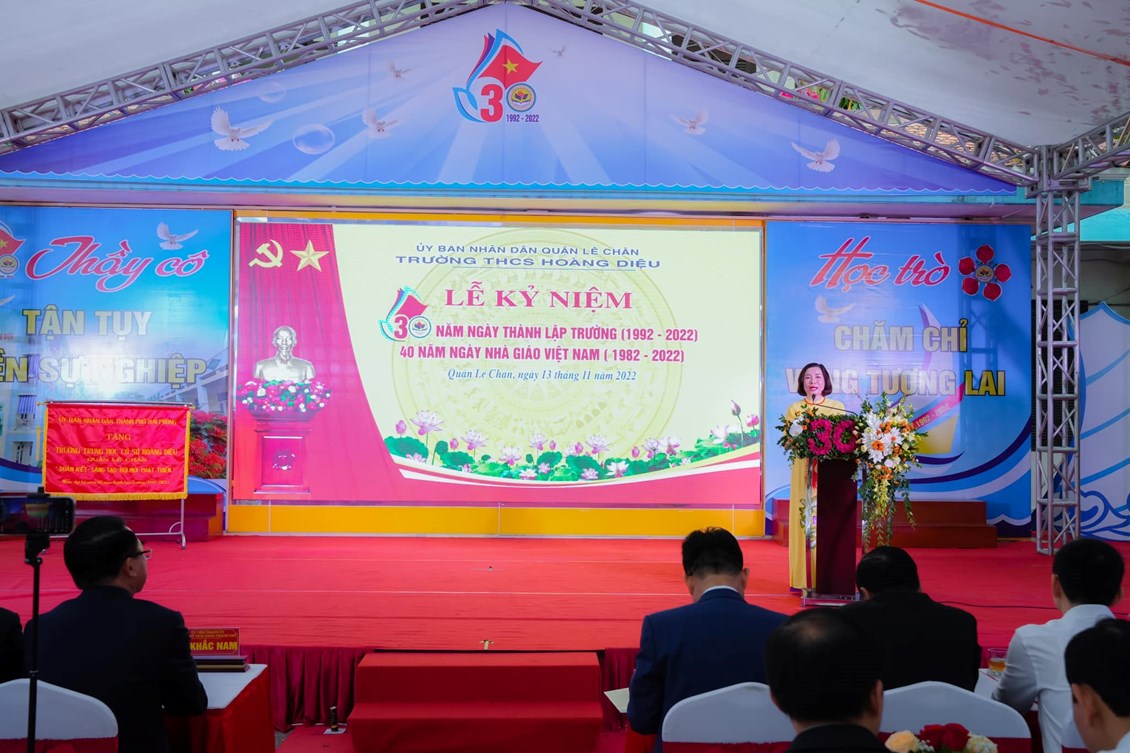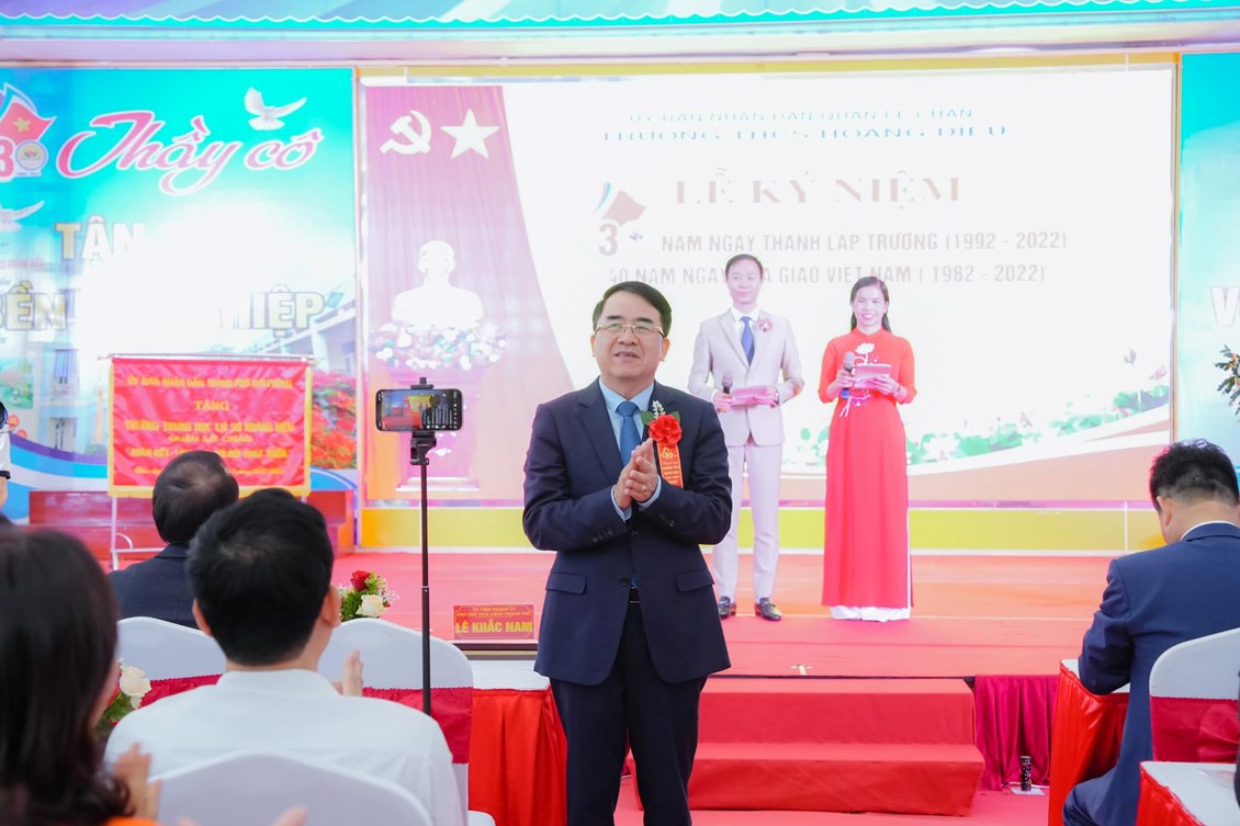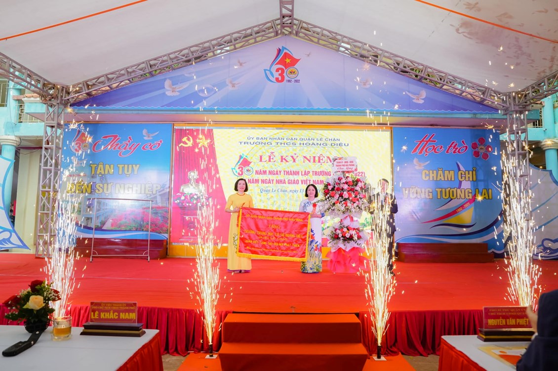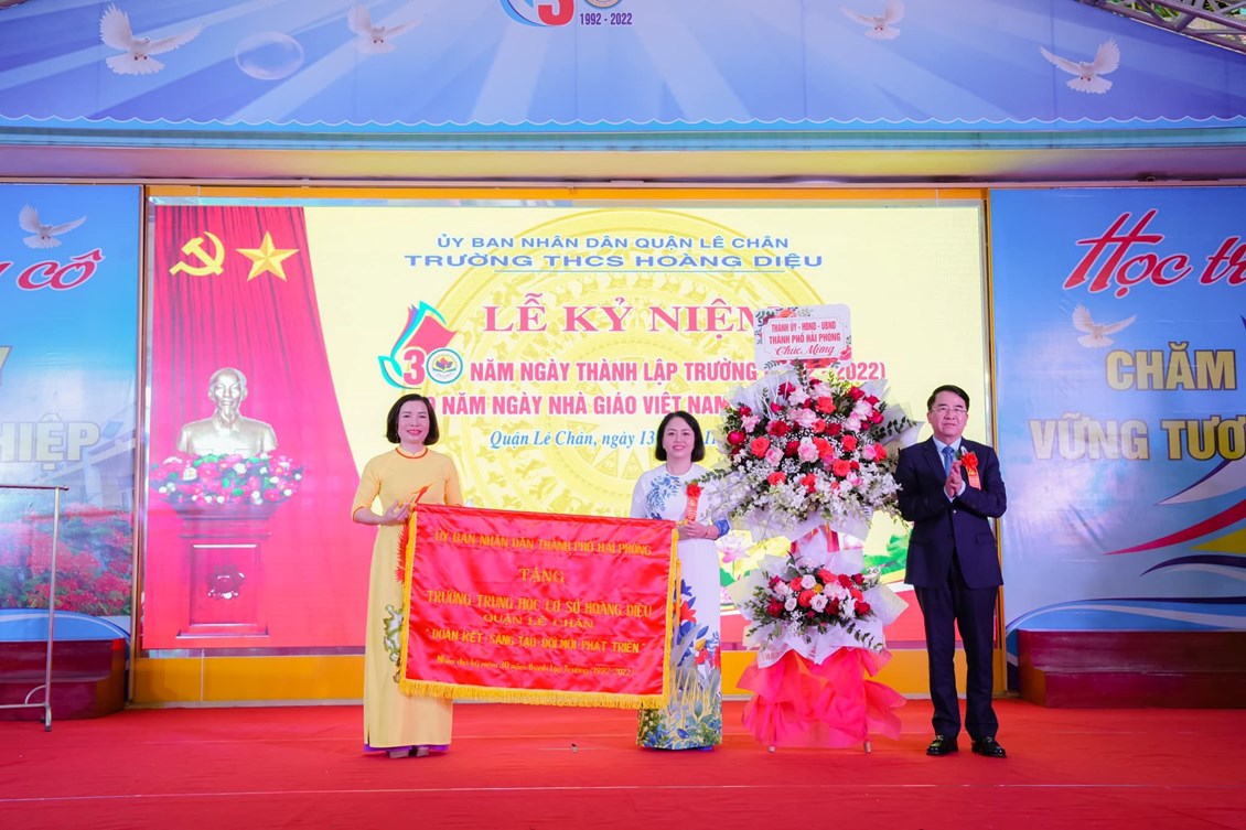 Ông Lê Khắc Nam - Ủy viên Thành ủy, Phó Chủ tịch thường trực UBND thành phố Hải Phòng trao hoa chúc mừng và bức trướng của UBND Thành phố mang dòng chữ “TRƯỜNG THCS HOÀNG DIỆU QUẬN LÊ CHÂN “ĐOÀN KẾT - SÁNG TẠO - ĐỔI MỚI - PHÁT TRIỂN” nhân dịp Kỷ niệm 30 năm thành lập trường (1992-2022) cho thầy trò nhà trường.