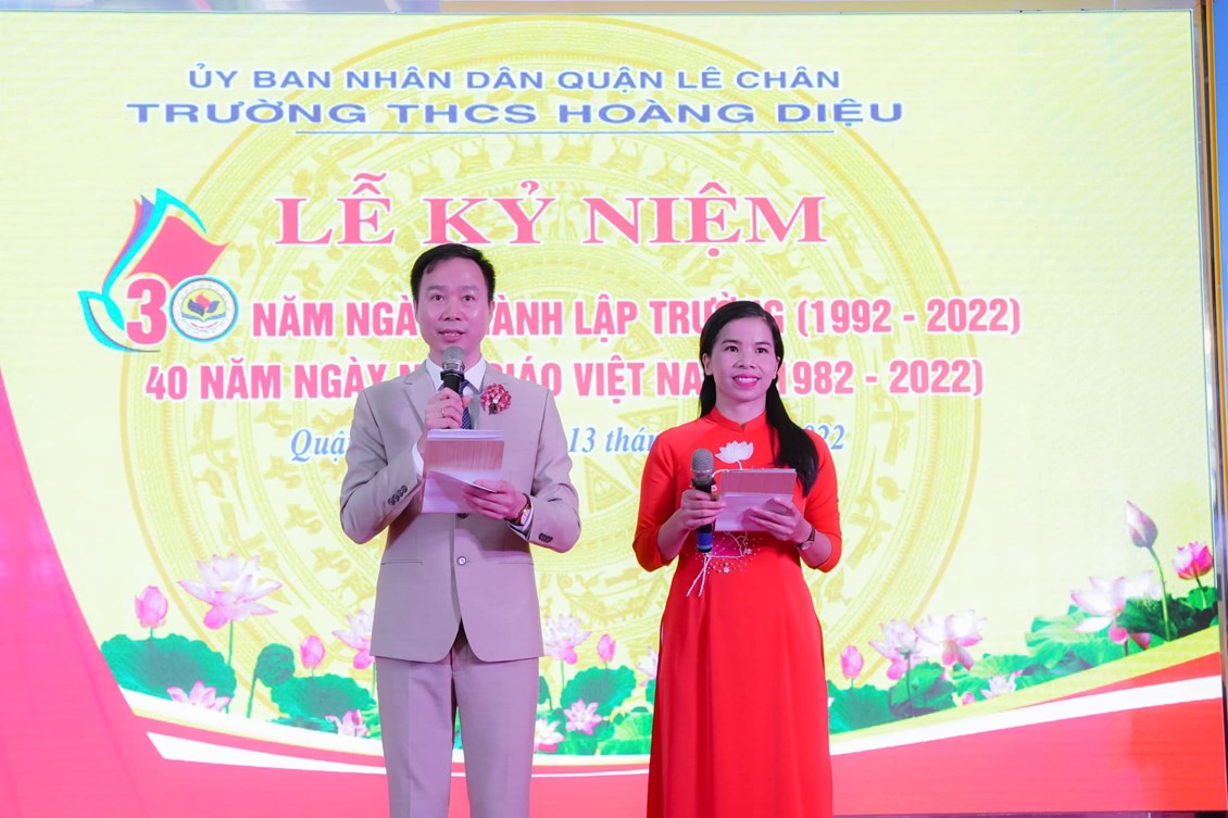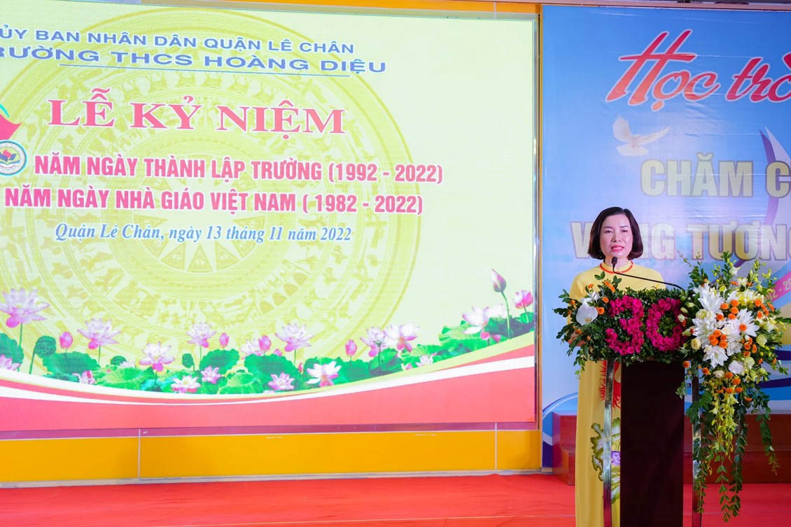 Mở đầu buổi lễ là Diễn văn kỷ niệm của Nhà giáo Trần Thị Kim Xuyến - Bí thư Chi bộ, Hiệu trưởng Trường THCS Hoàng Diệu. Thay mặt Nhà trường, cô gửi lời cảm ơn sâu sắc, lời kính chúc sức khỏe các ban ngành, đoàn thể, các cơ quan thông tấn, báo chí đã có mặt và chung vui với thầy trò nhà trường. Cô khẳng định 30 năm không phải là một khoảng thời gian quá dài, nhưng đã ghi dấu một chặng đường xây dựng và phát triển không ngừng của Nhà trường với mục tiêu lớn nhất là xây dựng nhà trường thành đơn vị giáo dục chất lượng, tạo dựng môi trường giáo dục với nền tảng là kỷ cương, nề nếp và các giá trị sống cốt lõi: “đoàn kết, trung thực, trách nhiệm, hợp tác, nhân ái, tự trọng, khiêm tốn”. Đồng thời bày tỏ niềm tin trường THCS Hoàng Diệu sẽ tiếp tục vững niềm tin, bền chí hướng, thi đua dạy tốt - học tốt, khát khao vươn lên tầm cao mới, chinh phục cuộc cách mạng công nghiệp 4.0, và những đòi hỏi của nền kinh tế tri thức.