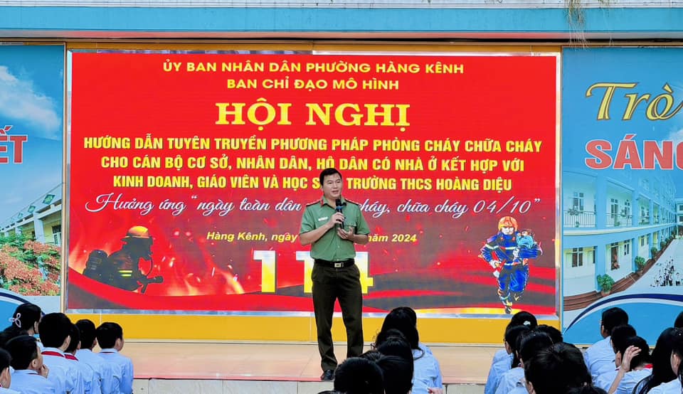 Thực hiện Kế hoạch số 237/KH-UBND ngày 10/9/2024 của UBND quận Lê Chân về tổ chức các hoạt động hưởng ứng 23 năm “Ngày toàn dân phòng cháy, chữa cháy (04/10/2001-04/10/2024)”, sáng ngày 04/10/2024, Trường THCS Hoàng Diệu phối hợp với Phòng Cảnh sát PCCC quận Lê Chân và phường Hàng Kênh tổ chức buổi tuyên truyền phòng cháy, chữa cháy cho cán bộ, giáo