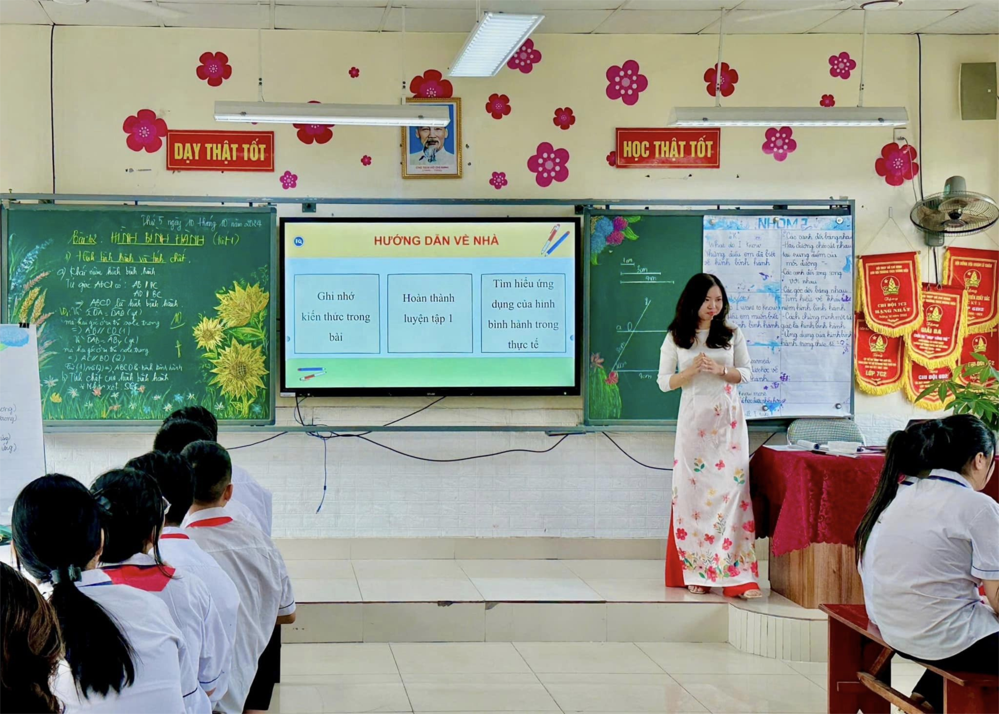 tình huống thực tế liên quan đến hình bình hành, tạo cảm hứng cho việc khám phá bài học. Các em làm việc theo nhóm, vẽ hình và thảo luận về những tính chất đặc biệt của loại tứ giác này. Qua đó, học sinh có cơ hội phát triển tư duy toán học, khả năng làm việc nhóm và giải quyết vấn đề.