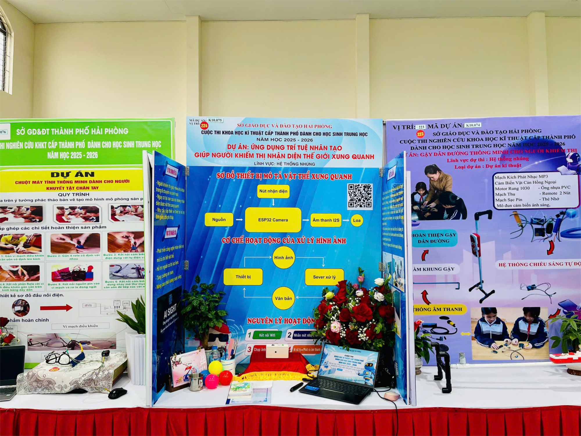 Tại vòng Chung kết cuộc thi KHKT cấp Thành phố năm học 2025 – 2026 diễn ra ngày 30/12/2025 tại trường THPT Hồng Bàng vừa qua, dự án “Ứng dụng trí tuệ nhân tạo giúp người khiếm thị nhận diện thế giới xung quanh” thuộc lĩnh vực Hệ thống nhúng của hai học sinh Nguyễn Thị Cẩm Nhung và Đặng Thị Minh Anh (lớp 9A2) do cô giáo Phạm Thị Phương Tâm hướng dẫn đã xuất sắc vượt qua nhiều đề tài để đạt giải Tư chung cuộc.