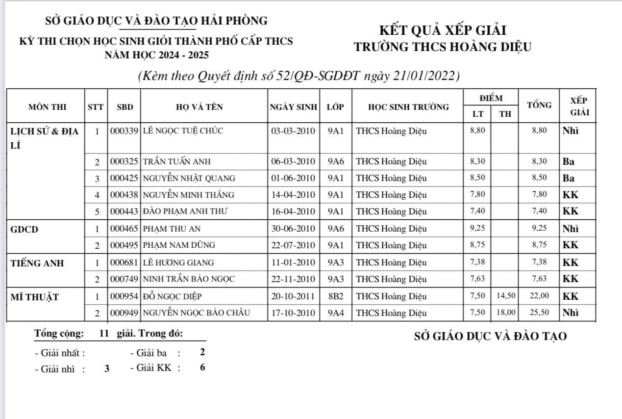Trong kỳ thi học sinh giỏi cấp thành phố năm học 2024-2025, trường THCS Hoàng Diệu đã xuất sắc đạt được nhiều thành tích đáng tự hào: