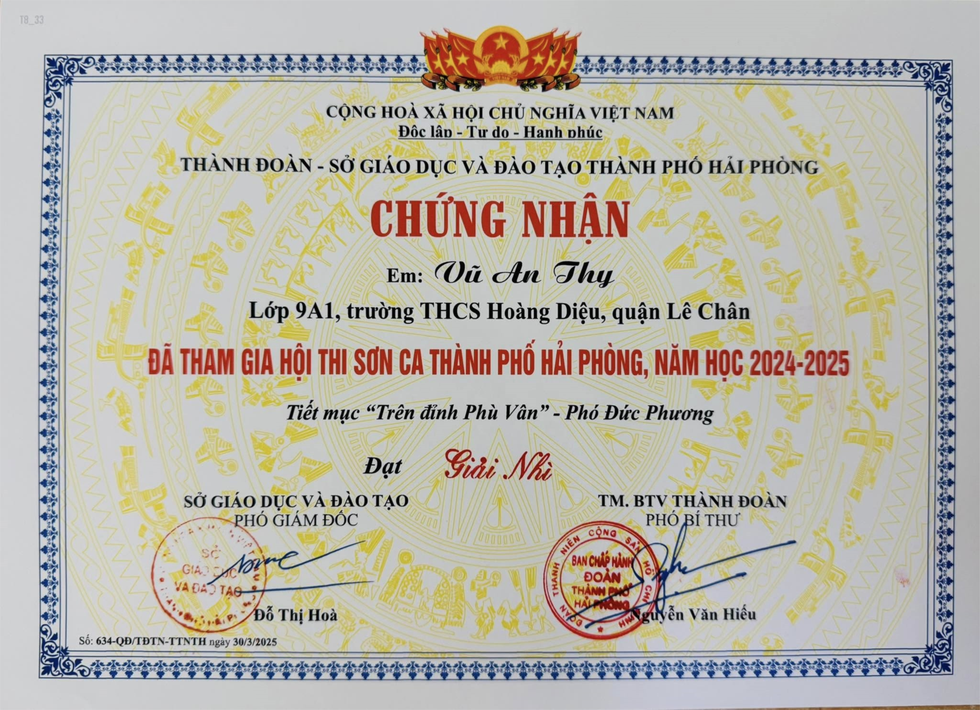 Lựa chọn một ca khúc rất nổi tiếng của cố nhạc sĩ Phó Đức Phương - bài hát Trên đỉnh Phù Vân, em An Thy cùng các bạn học sinh trong đội VNXK của nhà trường đã thể hiện thành công tiết mục này. Kết quả chung cuộc, em Vũ An Thy giành giải Nhì cấp Thành phố