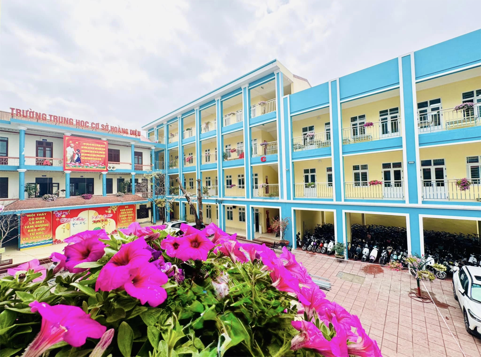 Giữa không gian xanh mát, những bông hoa như gửi gắm niềm vui, khích lệ thầy cô và học trò bước vào tháng mới với tinh thần tươi trẻ, hứng khởi.