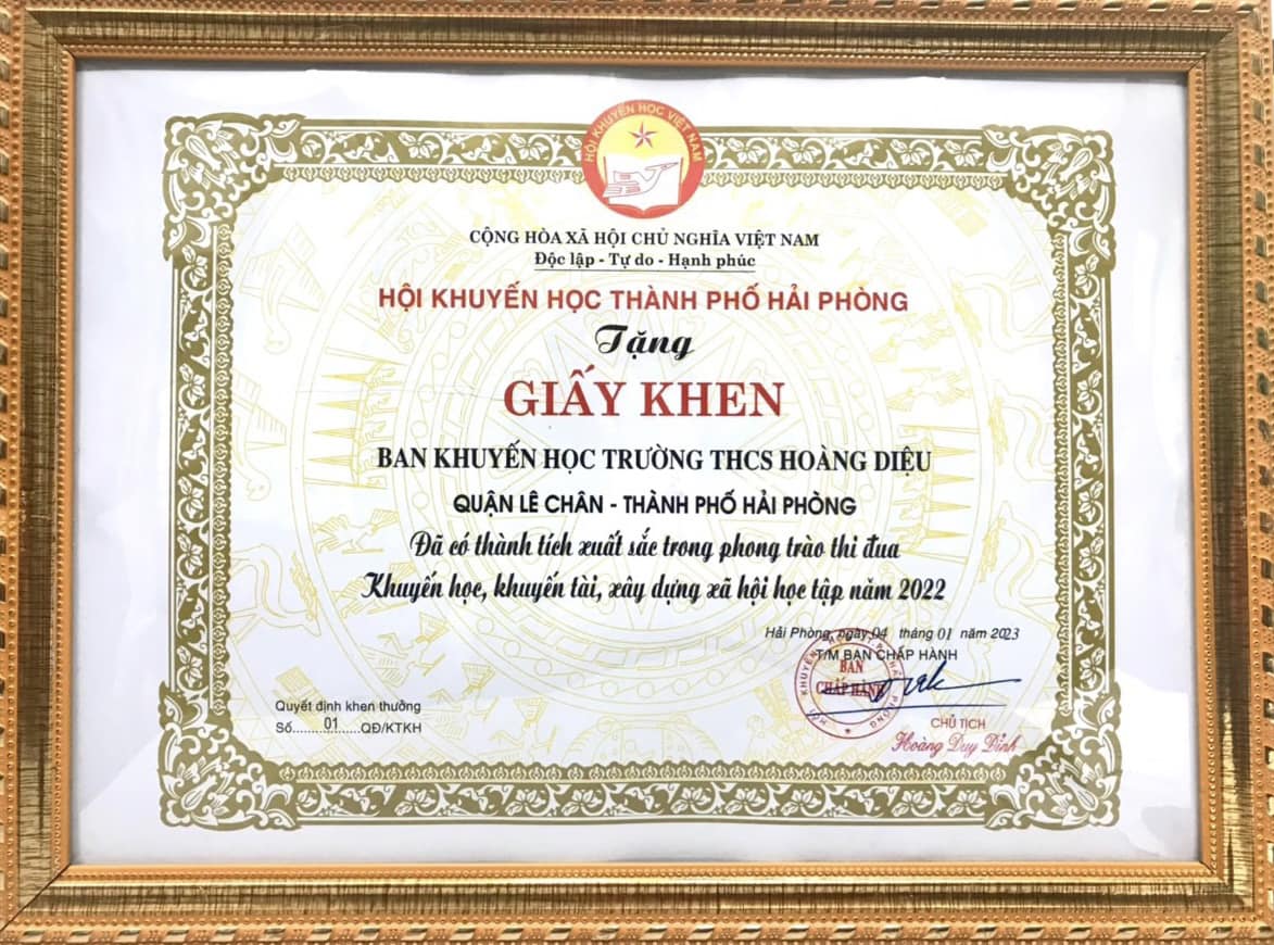 Tại Hội nghị thật vinh dự cho trường THCS Hoàng Diệu được Hội Khuyến học Thành phố Hải Phòng tặng Giấy khen “Đã có thành tích xuất sắc trong phong trào thi đua Khuyến học, khuyến tài và xây dựng xã hội học tập năm 2022”