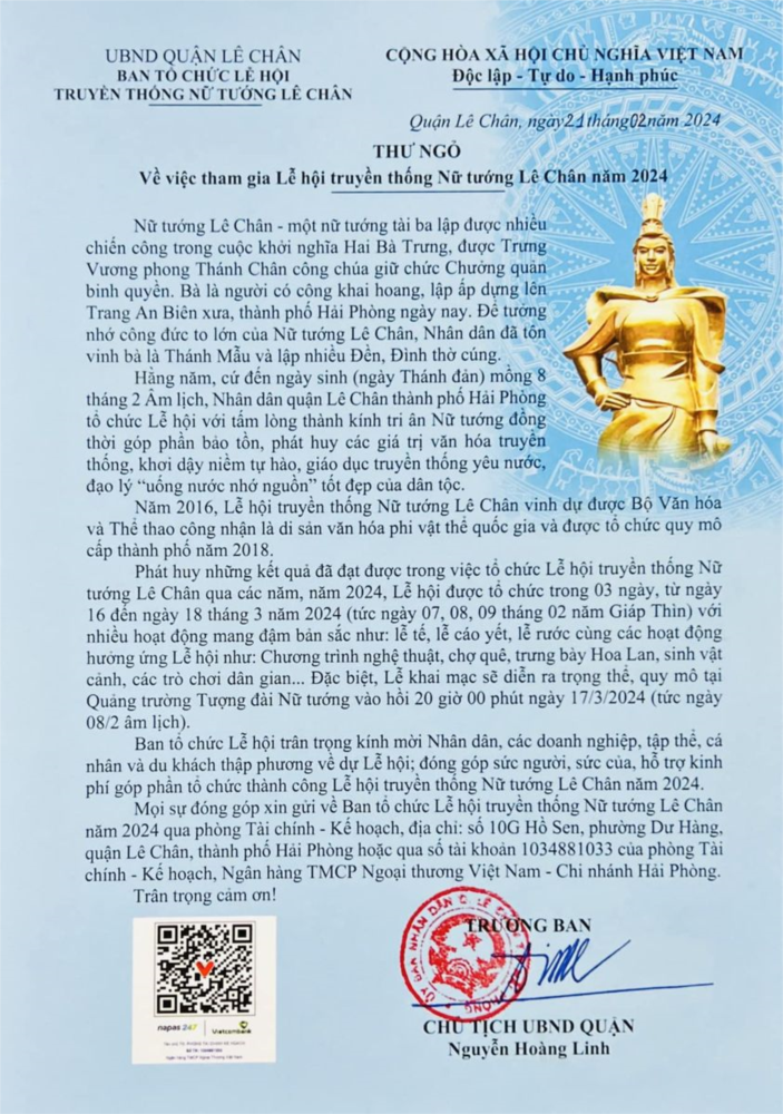 sinh hãy tuỳ tâm công đức, tham gia, cổ vũ, lan toả và cùng với nhân dân quận nhà tổ chức thành công Lễ hội Nữ tướng Lê Chân; góp phần gìn giữ nét đẹp văn hoá truyền thống của quê hương, đất nước và nhân dân Đất Cảng.